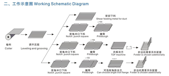 Duct Manufacture line 4 are consists of a uncoiler, leveler with beading function, encoder, hydraulic notching system, slide pittsburgh lock machine, hydraulic bending&shearing system; industry CNC control system and special duct manufacture software.