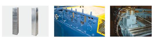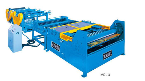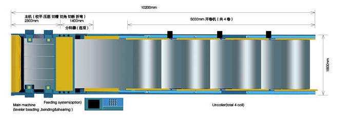 風管3線由開卷機(電動),矯平機,壓筋機,編碼器,液壓切角切槽(4套專用風管模具),液壓折彎機,液壓剪板機,工業級數控系統及MEIFORMER公司專用的風管生產線軟件組成。可自動實現風管板料的定尺寸剪斷,壓筋,風管的自動切槽,切角功能及自動折彎成“L”,“U”, “口”型風管,具有自動化程度 高,省人工,高效率,省材料的優點。非常適合中等規模的風管加工廠和一般的五金加工開料。標準配置包括兩個料卷(電動),主機包括矯平,壓筋,編碼器,液壓切槽切角系統,風管折彎剪切系統及數控系統。選項為板料分料器(方便送料),增加開卷機。