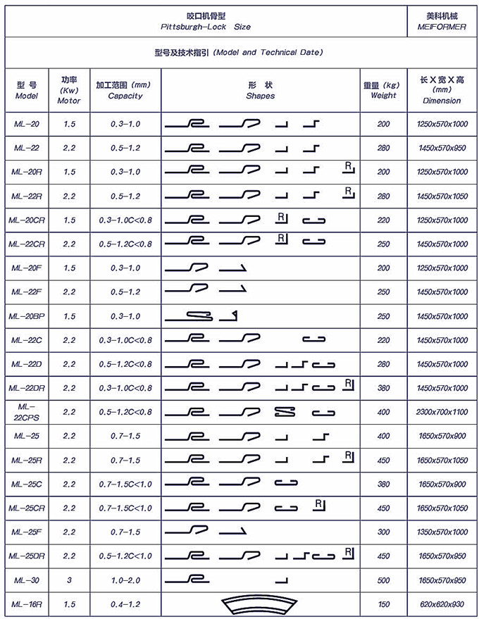 咬口機是通風管道制作行業應用最廣,最重要的機器之一、MEIFORMER公司的產品配有高質量精加工輥輪、優質馬達、高精度軸承、重型底盤;箱體加固、軸經過磨圓、焊接的鋼結構支架。保證機器的高效率和長壽命、為你節約成本。